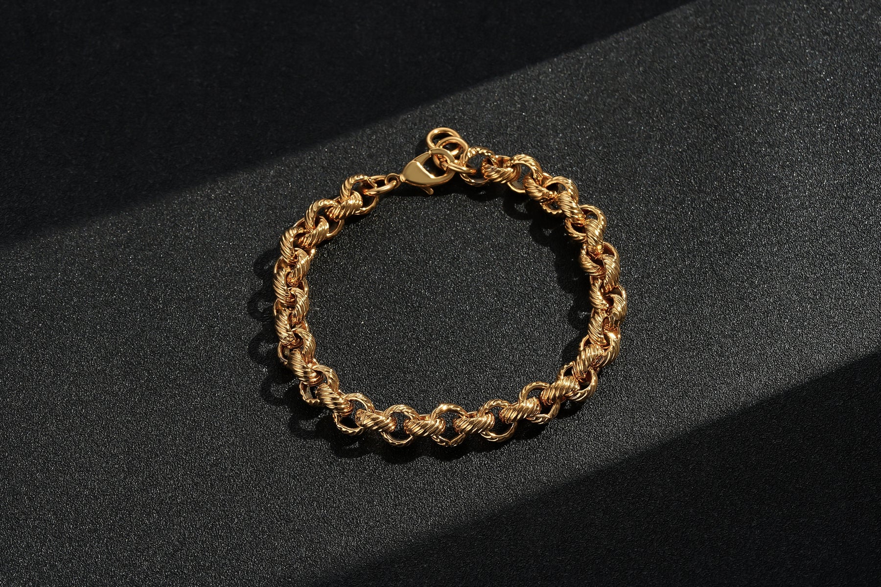 This bracelet is meticulously designed to offer the beauty and luxury of gold at a fraction of the cost. The gold-filled bonding process ensures a durable and radiant finish, while the intricate lined pattern adds texture and depth to its design. Perfect for elevating your everyday look or complementing your attire for special occasions, this piece is versatile, stylish, and built to last.
