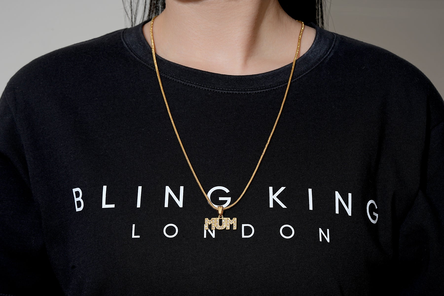 The pendant features a bold “MUM” design embellished with sparkling diamond-effect accents, symbolising love and appreciation. It is paired with a sleek 22-inch gold snake chain, which drapes gracefully against the neckline, making it suitable for both casual and formal wear.