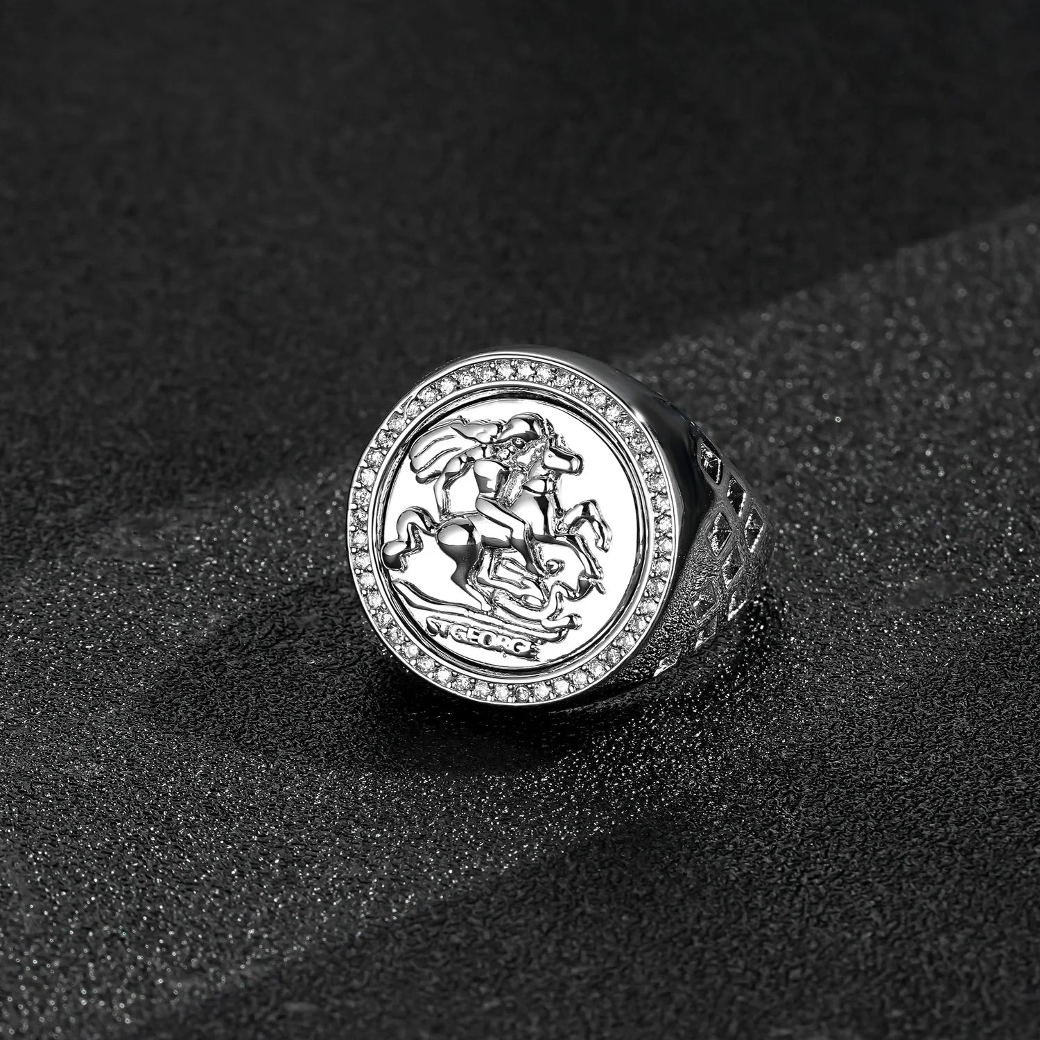 Experience timeless elegance with this Silver St George Sovereign Adjustable Ring with Stones, designed for those who appreciate meaningful and refined jewellery. Featuring the iconic St George sovereign design, this ring symbolises strength, protection, and heritage while offering a bold yet sophisticated look.